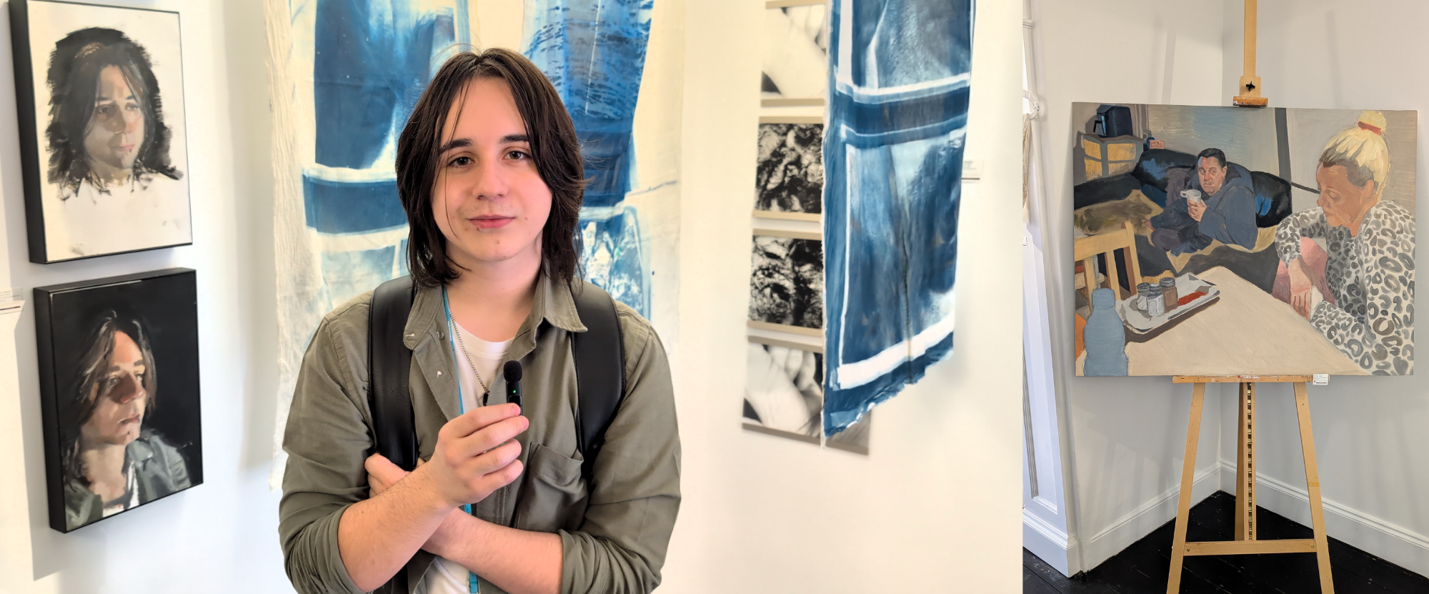 My name is Andrei Petrache. I'm a student at LAET, and I did A-level Art. This is a triptych, three paintings in one set, where I explored self-portraiture. At the start of my component, I wanted to see whether I could use self-portraiture to study the relationship between the artist and the viewer.